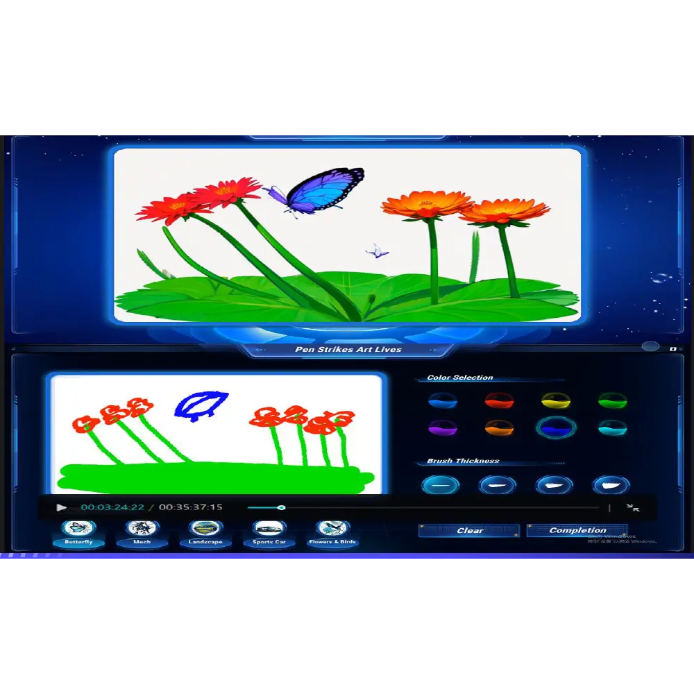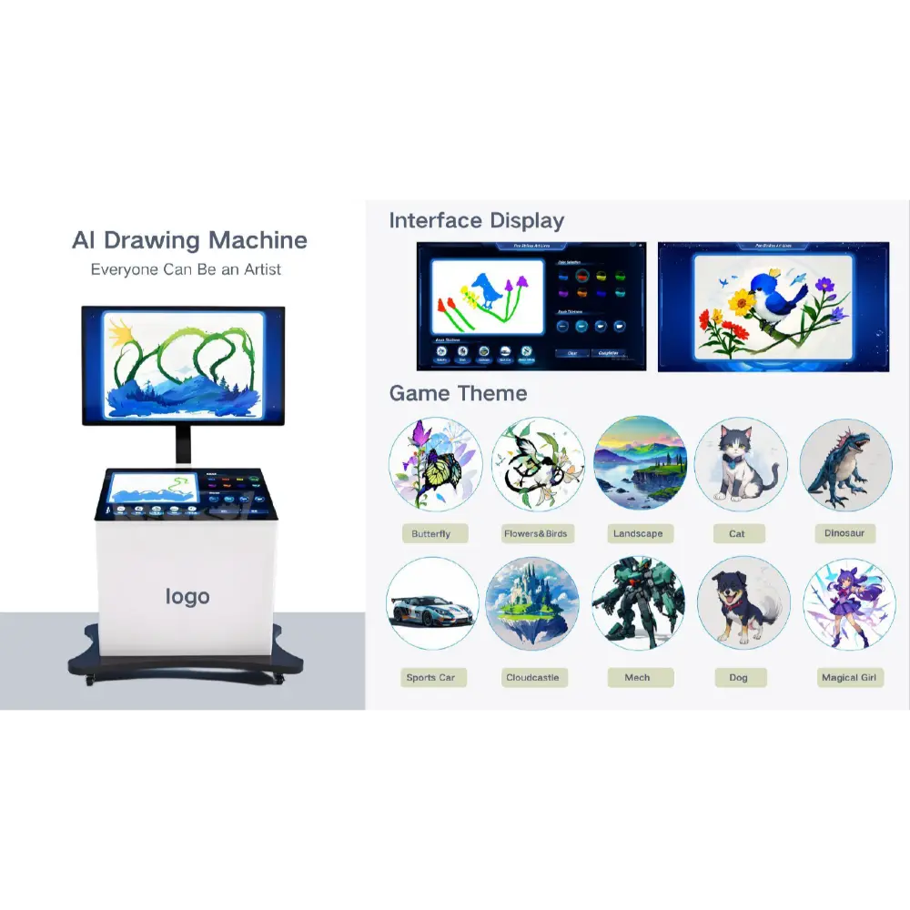 The Artificial Intelligence Interactive Drawing System is an innovative device that enables anyone to become an artist by utilizing artificial intelligence to create stunning digital artwork. With its sleek metal casing and multilingual interface, this machine offers an intuitive and interactive experience for users of all skill levels. It features a large 43-inch display, accompanied by a 32-inch capacitive touch screen, enabling seamless interaction and customization. Users can select from a variety of brush thicknesses and colors to craft unique digital paintings. Its AI Drawing Generation Software offers a range of themes, including butterflies, landscapes, magical girls, and even complex designs like sports cars and mechs. Whether in schools, children’s parks, science museums, or other interactive spaces, this machine encourages creativity and exploration. Powered by dual voltage support (110V/220V) and an 800W system, it ensures reliability while delivering high-quality artwork. The Artificial Intelligence Interactive Drawing System is truly a fusion of technology and art, making artistic expression more accessible and engaging.