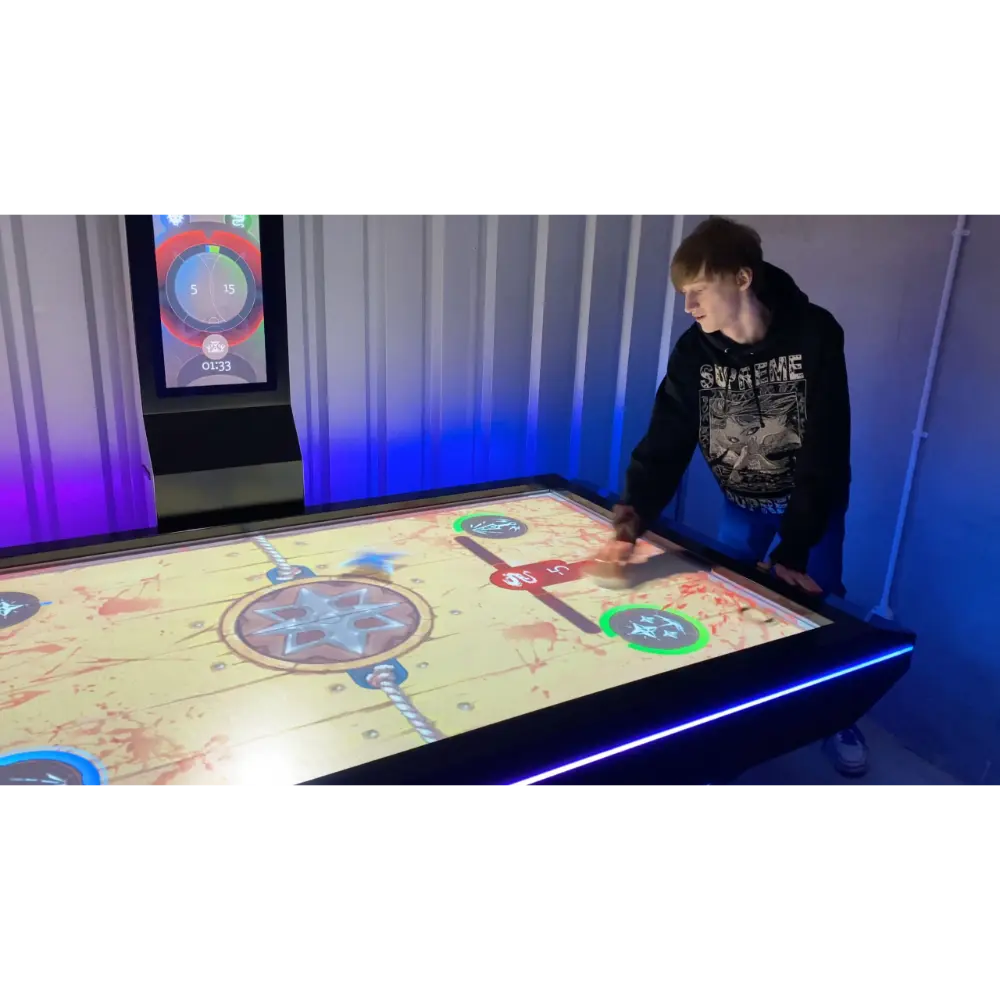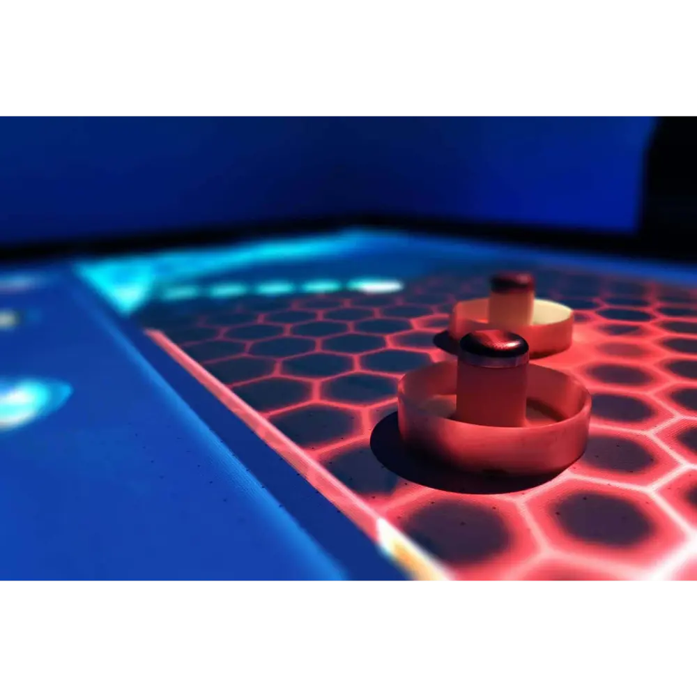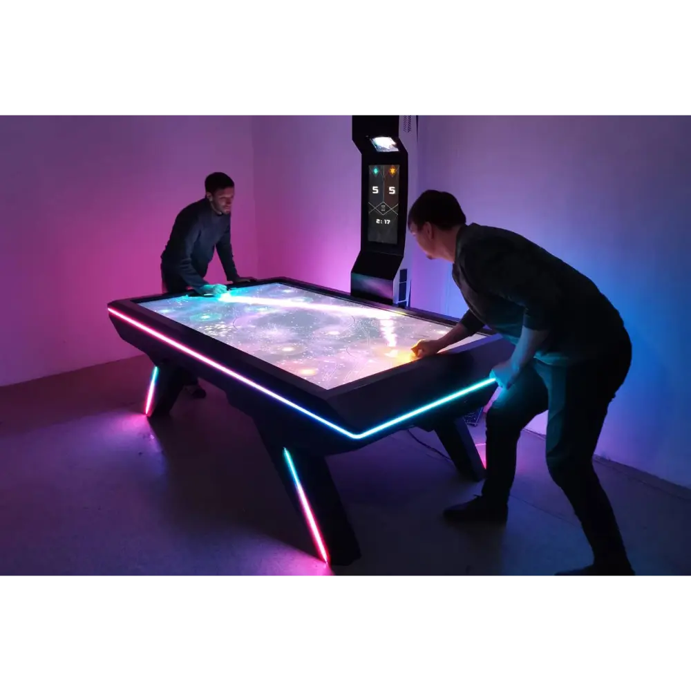 The Augmented Reality Air Hockey is a cutting-edge entertainment solution that merges traditional air hockey mechanics with interactive digital projection. Players use real paddles and a physical puck, but the playing surface is transformed by high-quality AR visuals that respond dynamically to gameplay. The system currently supports five different game modes, each offering unique visual effects and challenges that require players to adapt their strategies to the digital overlays. The table itself is built for durability and visual appeal. It features a matte-finish steel body, ensuring long-term resilience in high-traffic environments. Aesthetic enhancements include recessed LED strip lighting around the table edges and legs, creating a futuristic ambiance that complements the AR experience. For operational flexibility, the unit supports contactless payments, coin mechanisms, or free-to-play configurations, making it suitable for arcades, exhibitions, and educational venues. Operators benefit from a built-in display panel that provides access to game analytics, enabling them to track usage patterns and optimize engagement. This combination of tactile gameplay, immersive visuals, and robust hardware makes AR Air Hockey a standout attraction in any interactive gaming space.