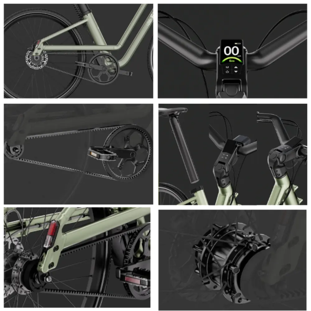 The Fiido C700 City Electric Bike is a sleek, urban commuter designed to blend style, comfort, and cutting-edge technology. With its lightweight aluminum alloy frame weighing just 19.7 kg, it’s easy to maneuver through city streets. The bike features a carbon belt drive system, which means no greasy chains, zero maintenance, and a whisper-quiet ride. Α 250W rear hub motor, paired with a Mivice S200 torque sensor, delivers smooth, intuitive pedal assistance that adapts to your effort, making every ride feel natural. The C700’s retro-inspired design includes a step-through frame in a soft sage green finish, hydraulic disc brakes for reliable stopping power, and CST 700C×40C tires that absorb urban vibrations. The 280.8Wh removable battery can travel up to 83 km in ECO mode and is easily rechargeable. A centered LCD, turn signals, and IP54 waterproofing round out its commuter-friendly features. It’s elegance on two wheels—perfect for daily rides or weekend cruising.