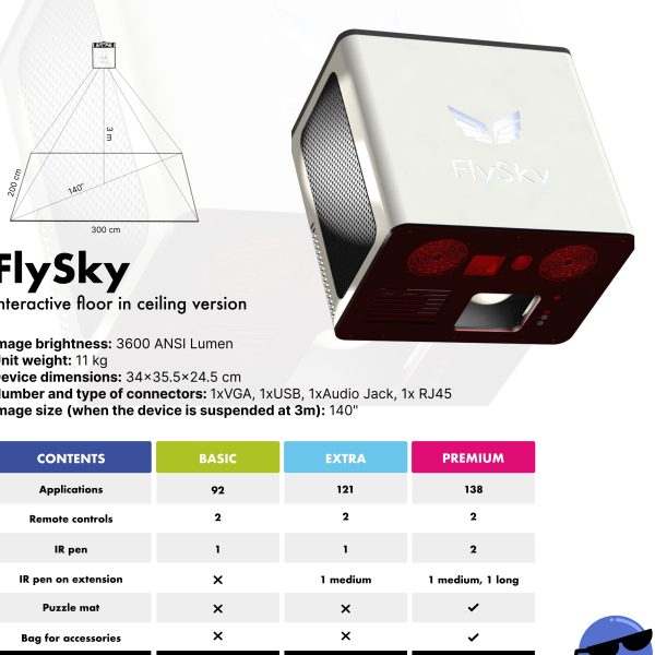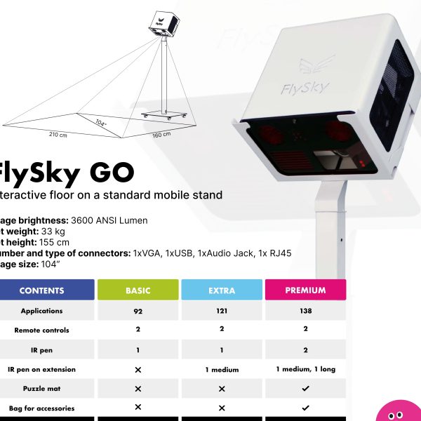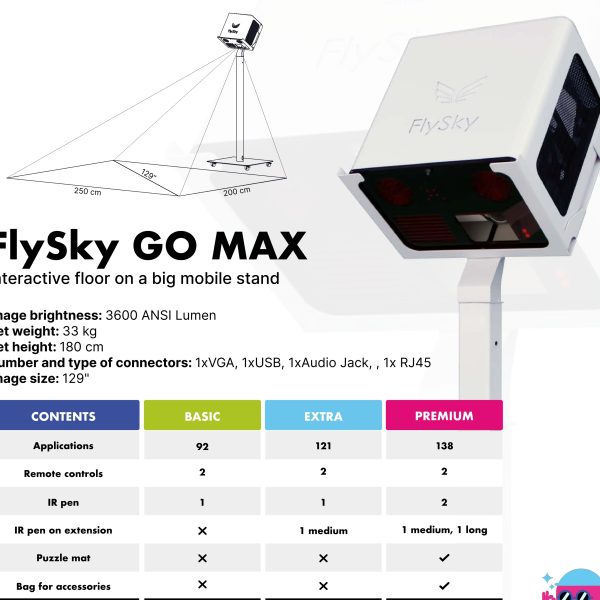 The FlySky Interactive Floor is a versatile education, training, and therapy tool. It provides an engaging and interactive learning experience through its interactive floor, which can be used for various educational games and applications. It offers a variety of educational games that cater to different subjects and learning styles: Math Games, Language Games, Science and STEAM Activities, Quizzes and Trivia, Physical Activity Games, Creative and Artistic Games, Problem-Solving and Logic Games. It uses all senses to make learning, training, and therapy unforgettable and fun, enhancing cognitive curiosity and logical thinking. It is a versatile tool that can be used as an interactive floor and table, making it adaptable to different environments and needs. It supports children with special educational needs by providing an appropriate and attractive working environment, which can be modified to achieve therapeutic goals. FlySky eliminates delays in user interaction, adjusts to changes in room lighting, and recognizes and eliminates shadows, ensuring optimal image quality and user experience. The FlySky GO version offers mobility, allowing it to be easily moved between classrooms or different locations without the need for permanent installation.
