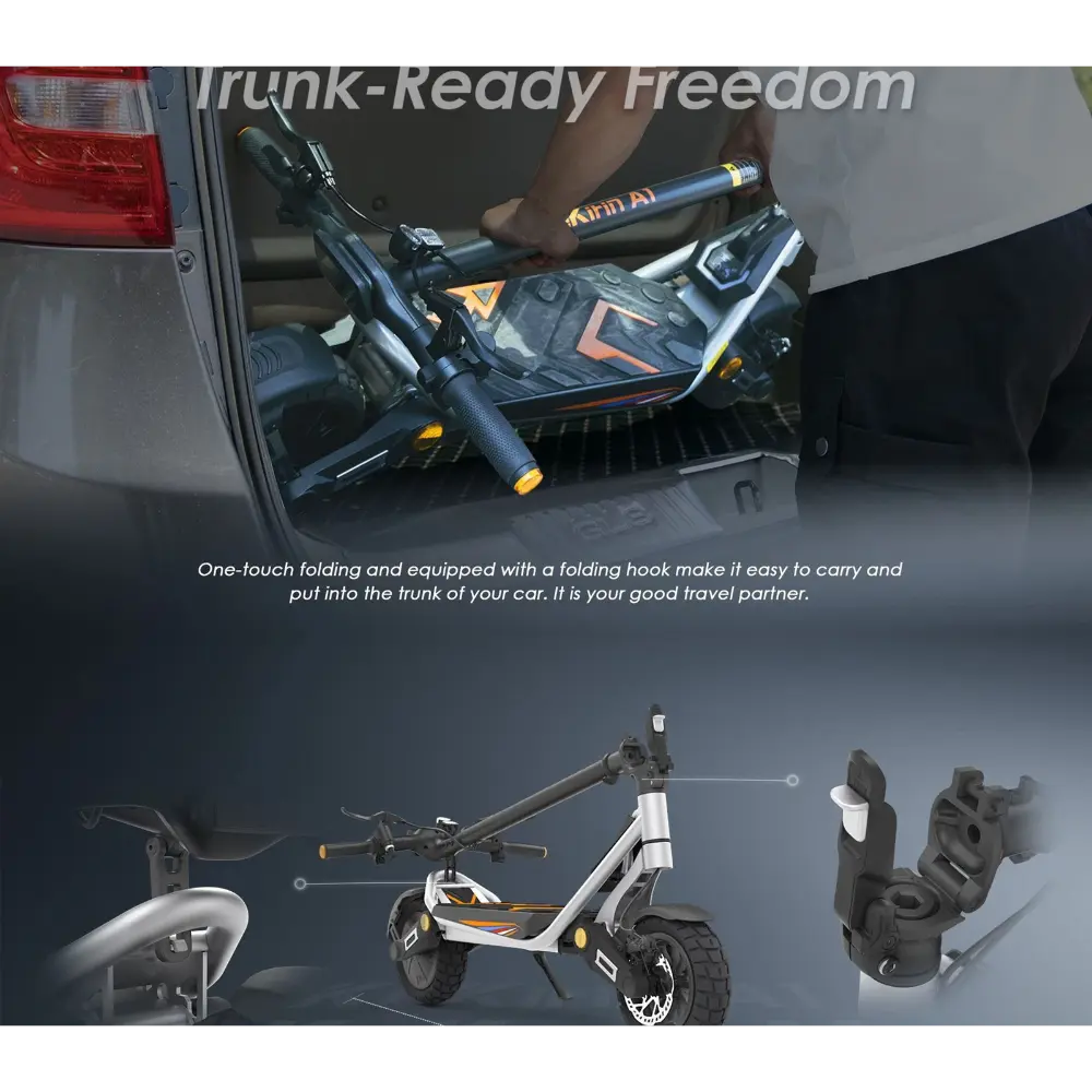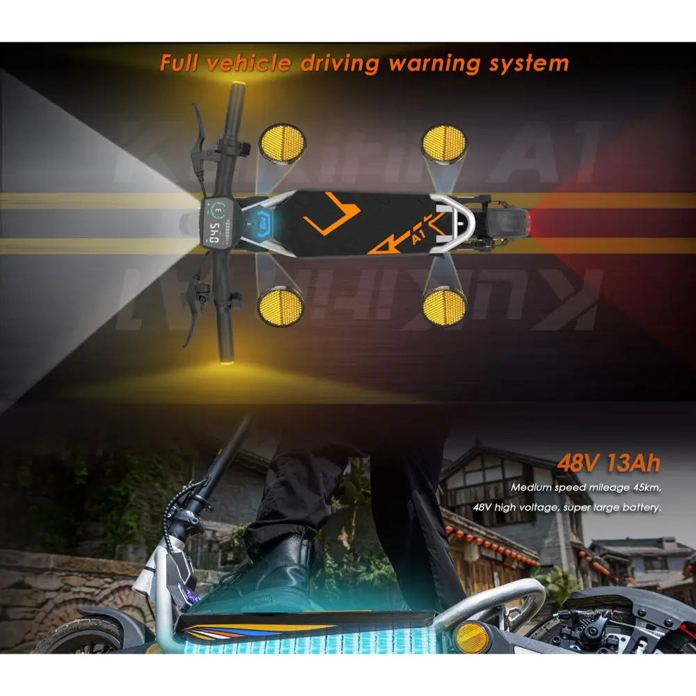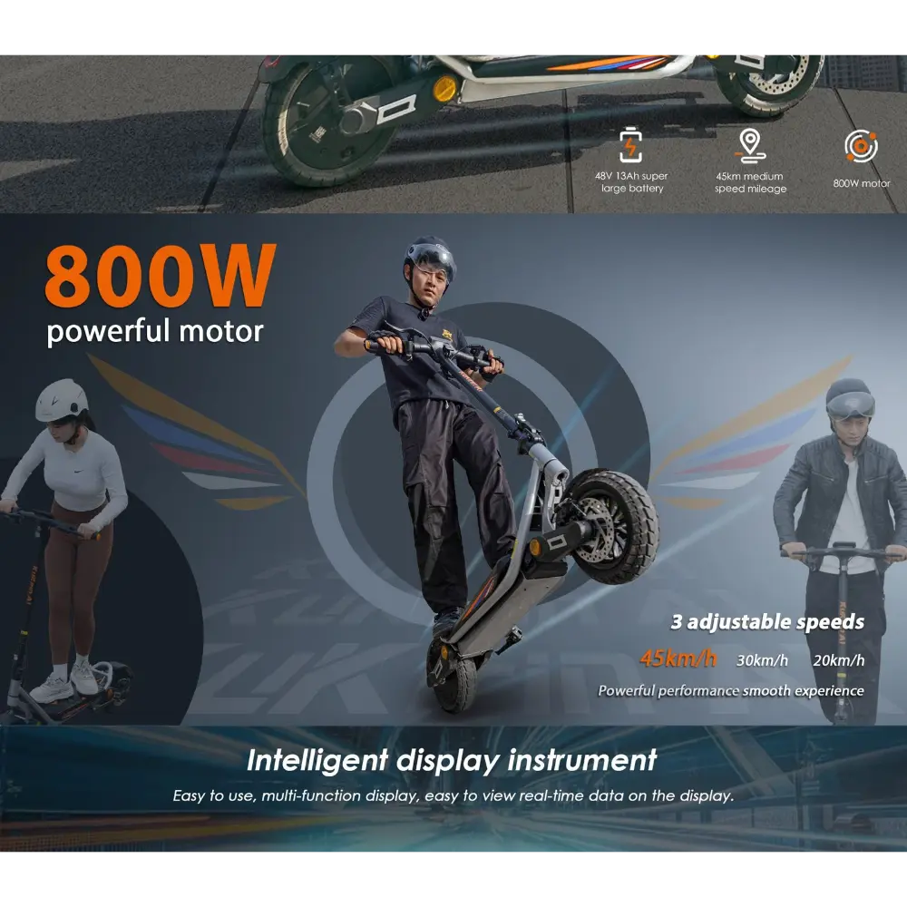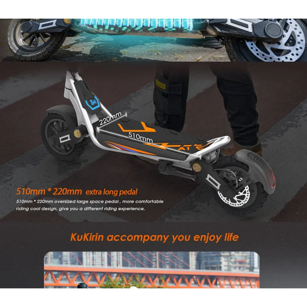 The KuKirin A1 Electric Scooter is a sleek and powerful electric scooter designed for urban commuting and weekend adventures. It features an 800W brushless motor that delivers a top speed of 45 km/h, making it one of the faster models in its class. Powered by a robust 48V 13Ah lithium battery, it offers a range of up to 45 kilometers on a single charge, ideal for medium-distance travel. Its 10-inch tubeless tires provide excellent grip and stability across various terrains, including asphalt, gravel, and cobblestone. The scooter is equipped with dual disc brakes and a power-off braking system, ensuring responsive and safe stopping even at high speeds. For added comfort, it includes front and rear shock absorbers that smooth out bumpy rides. The KuKirin A1 also boasts a smart LCD that shows speed, battery level, and riding mode. With a foldable frame, ambient lighting, and a modern aerodynamic design, it’s both practical and stylish. Whether you’re navigating city streets or cruising through parks, the KuKirin A1 delivers a dynamic and enjoyable ride.