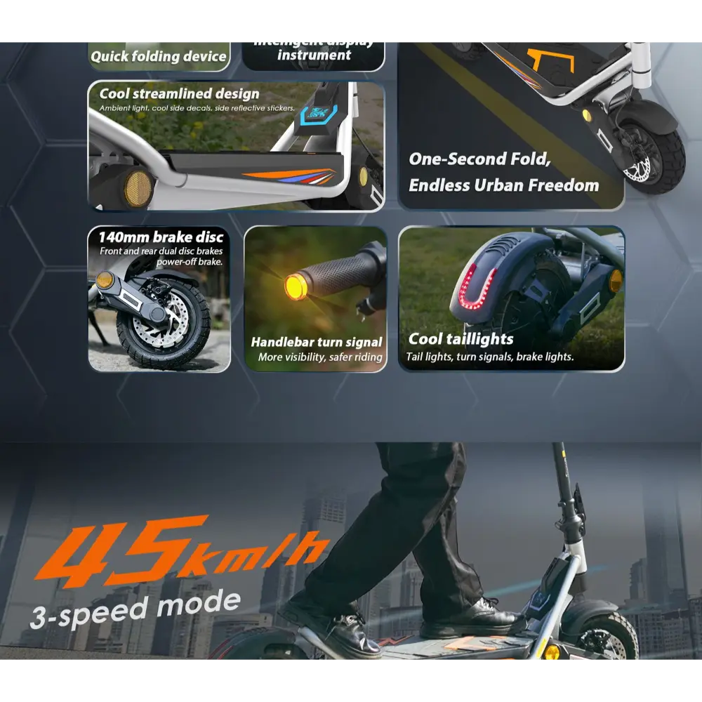 • Speed Modes: Three options – 20 km/h, 30 km/h, and 45 km/h
