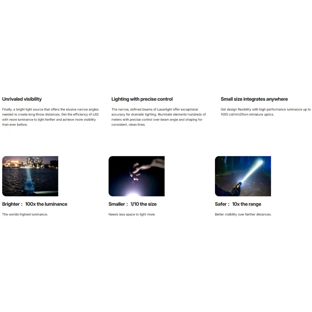 - Luminance: Up to 1000 cd/mm² — 100x brighter than standard lights