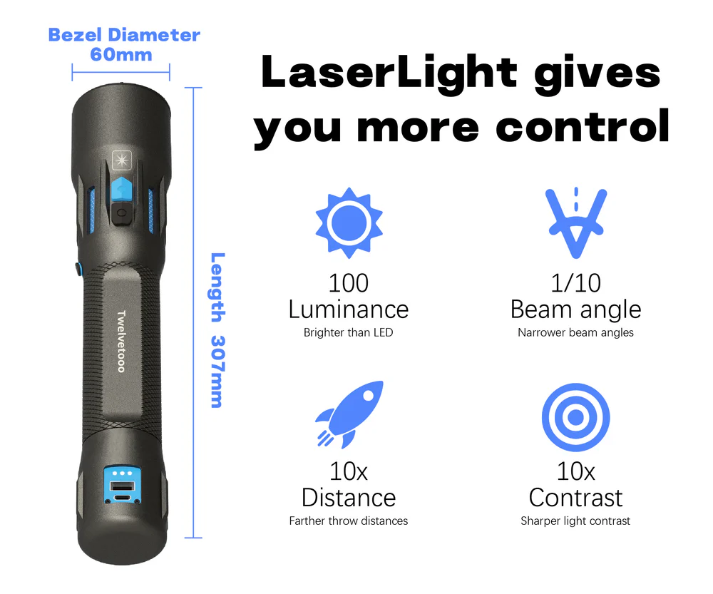 The Laser Flashlight with Powerful Beam is a revolutionary lighting device that combines cutting-edge laser technology with high-intensity LED illumination. Engineered for extreme visibility, it delivers a staggering 1000 lumens of brightness, capable of reaching distances up to 1.1 kilometers. At its core is a precision laser beam that provides a focused, narrow light path ideal for pinpoint accuracy. The surrounding LED array offers wide-angle illumination for broader coverage. This dual-light system makes it perfect for outdoor adventures, tactical operations, and emergencies. Despite its powerful output, the flashlight maintains a compact and lightweight design, making it easy to carry and operate. It’s powered by four rechargeable 18650 lithium-ion batteries, ensuring long-lasting performance. Built to withstand tough environments, it features IPX4 water resistance and impact protection. Whether you’re navigating dark terrain or signaling across vast distances, the Laser Flashlight delivers unmatched clarity, control, and reliability.