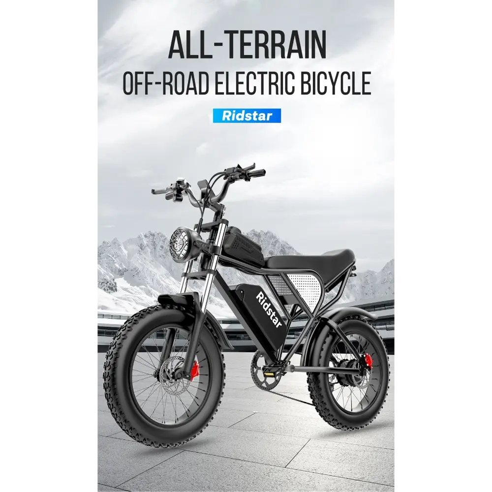 The Ridstar Q20 All-Terrain Electric Bike is a rugged, high-performance e-bike designed for both urban commuting and off-road adventures. Powered by a robust 1000W brushless motor, it delivers impressive torque and acceleration, reaching speeds up to 50 km/h. Its 48V 20Ah lithium battery offers a generous range—up to 120 km in pedal-assist mode—making it ideal for long-distance travel. Built with a durable aluminum alloy frame, the Q20 features 20×4.0-inch fat tires that provide excellent traction on diverse terrains, including snow, sand, and rocky trails. Shimano 7-speed gearing provides you with flexible control, and dual suspension (front and rear) guarantees a comfortable ride. Safety is enhanced with dual hydraulic disc brakes, LED lighting, and an LCD that tracks speed, battery life, and mileage in real time. With its sleek design, comfortable wide saddle, and multiple riding modes—including pure electric, pedal-assist, and manual—the Ridstar Q20 seamlessly blends power, style, and practicality into one thrilling ride.
