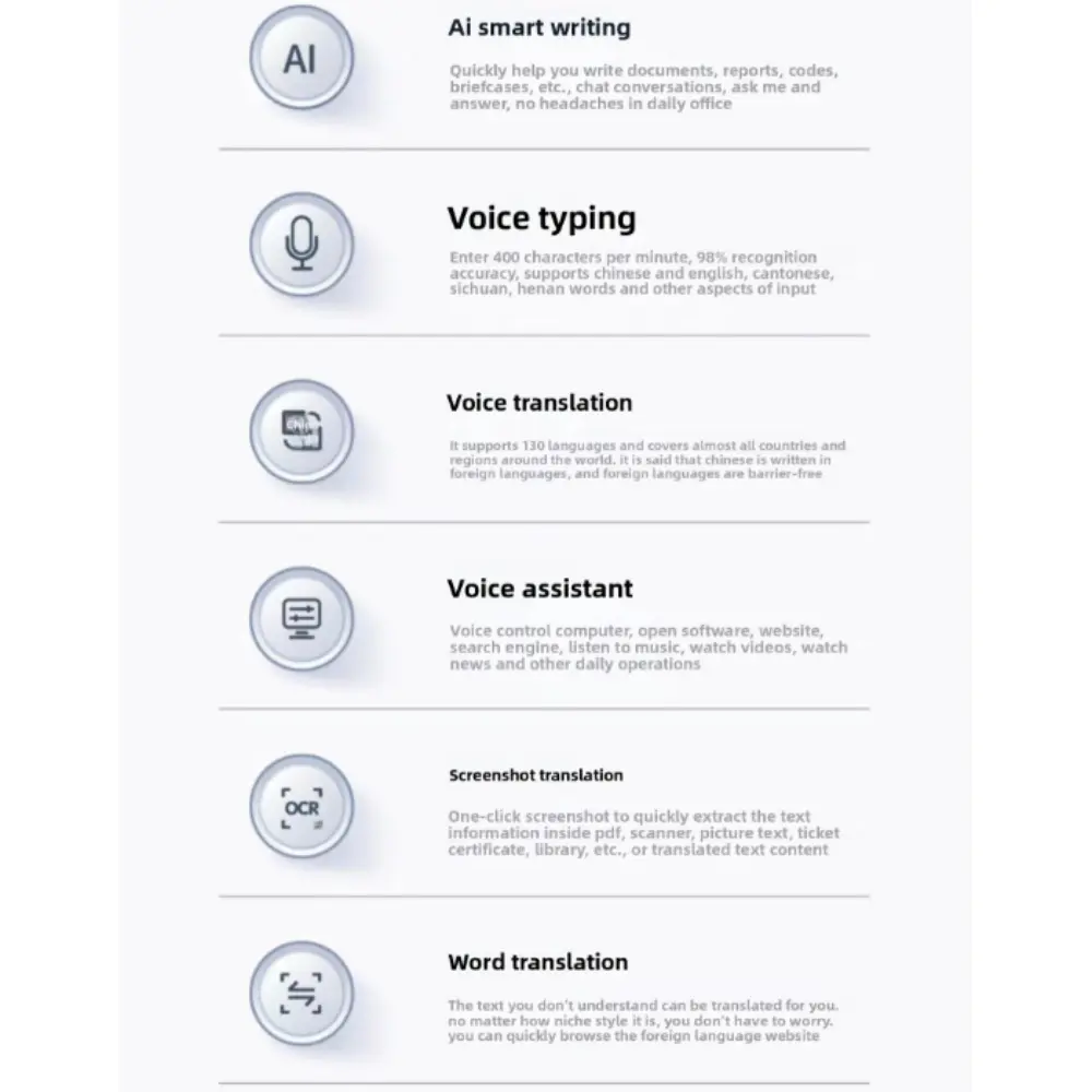 - Voice Features: AI Voice Typing, Real-Time Translation (supports 110+ languages), Voice Commands & Dictation, AI Writing Assistant (email, content, summaries)