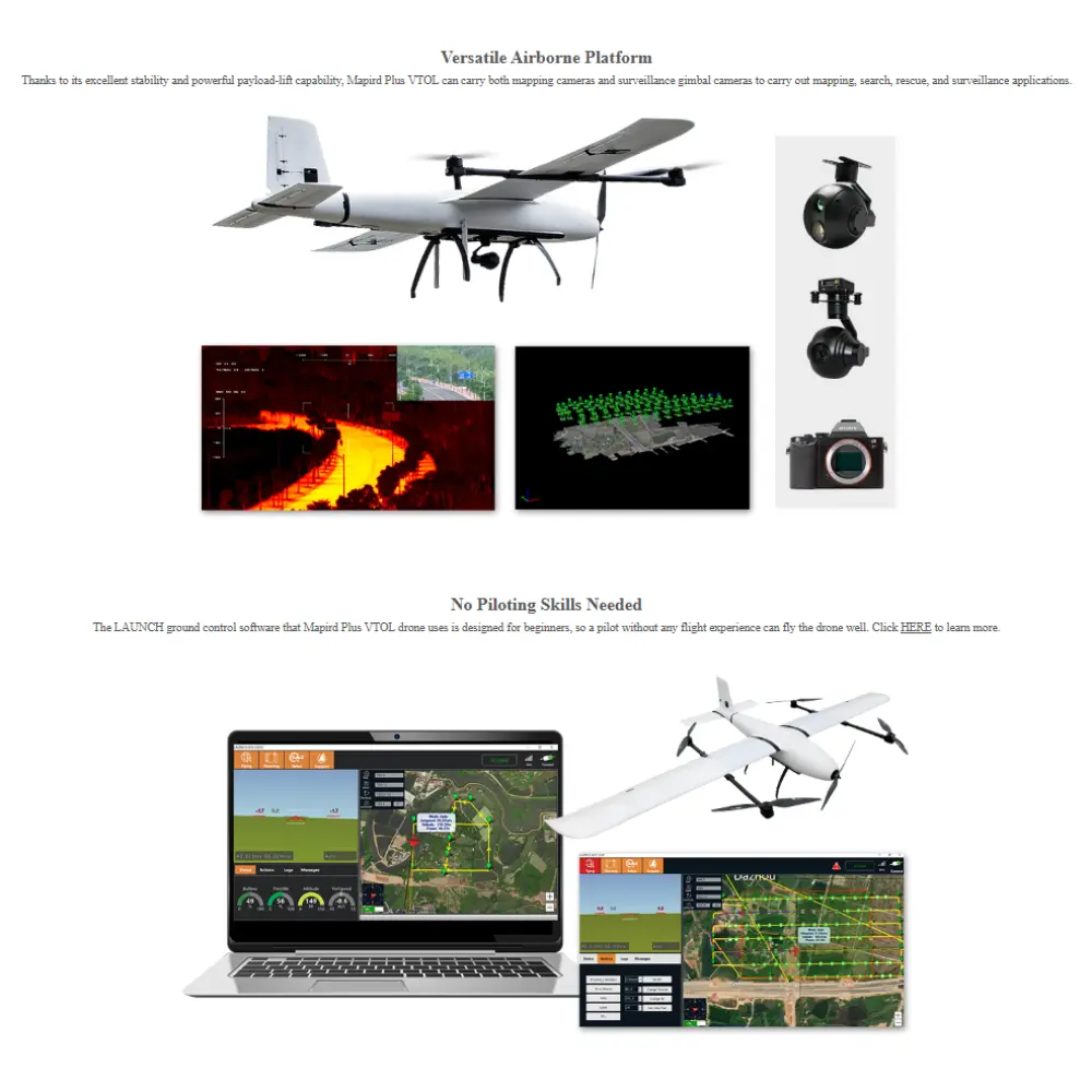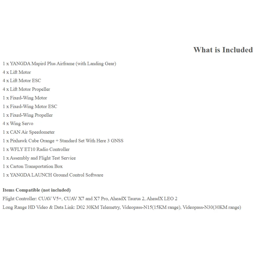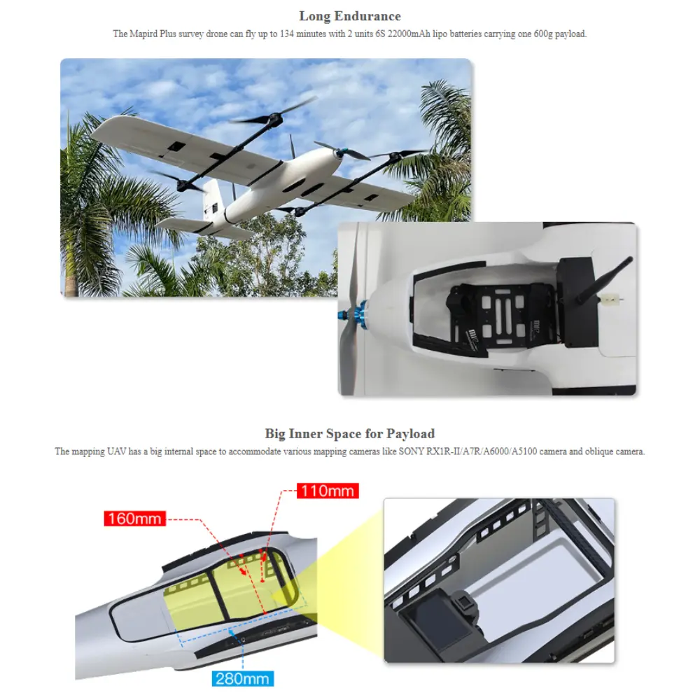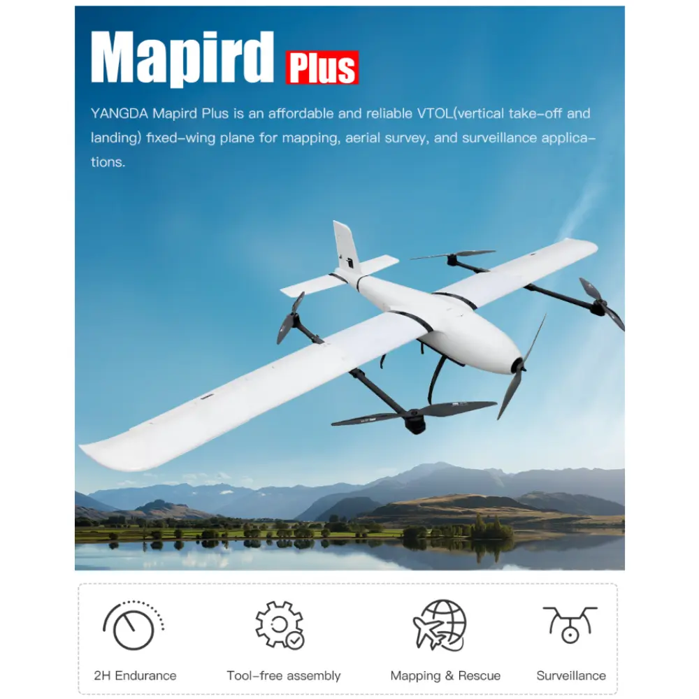 The YANGDA Mapird Plus Professional Long-Endurance VTOL Drone is a versatile long-endurance VTOL drone designed for professional mapping, aerial survey, and surveillance missions. The Mapird Plus stands out as an affordable yet reliable vertical take-off and landing (VTOL) fixed-wing aircraft, combining the agility of a quadcopter with the efficiency of a plane. It is equipped with four lift motors and one fixed-wing motor, enabling it to ascend vertically like a helicopter and then transition smoothly into forward flight for extended coverage. Compared to its predecessor, the Mapird Pro, the Plus version offers a larger wingspan, longer endurance, and greater payload capacity, making it suitable for demanding industrial and security applications. One of its key advantages is fast deployment: thanks to its modular airframe and foldable motor arms, a single operator can set up the drone in under three minutes. In terms of performance, the Mapird Plus can achieve up to 134 minutes of flight time when powered by dual 6S 22000mAh LiPo batteries while carrying a 600g payload. This endurance makes it ideal for large-scale mapping projects, border patrol, or environmental monitoring. The drone’s design emphasizes efficiency, portability, and adaptability, enabling it to operate across diverse terrain and mission profiles. Whether for surveying agricultural land, conducting security patrols, or supporting disaster response, the Mapird Plus delivers a balance of long-range capability, ease of use, and operational reliability.