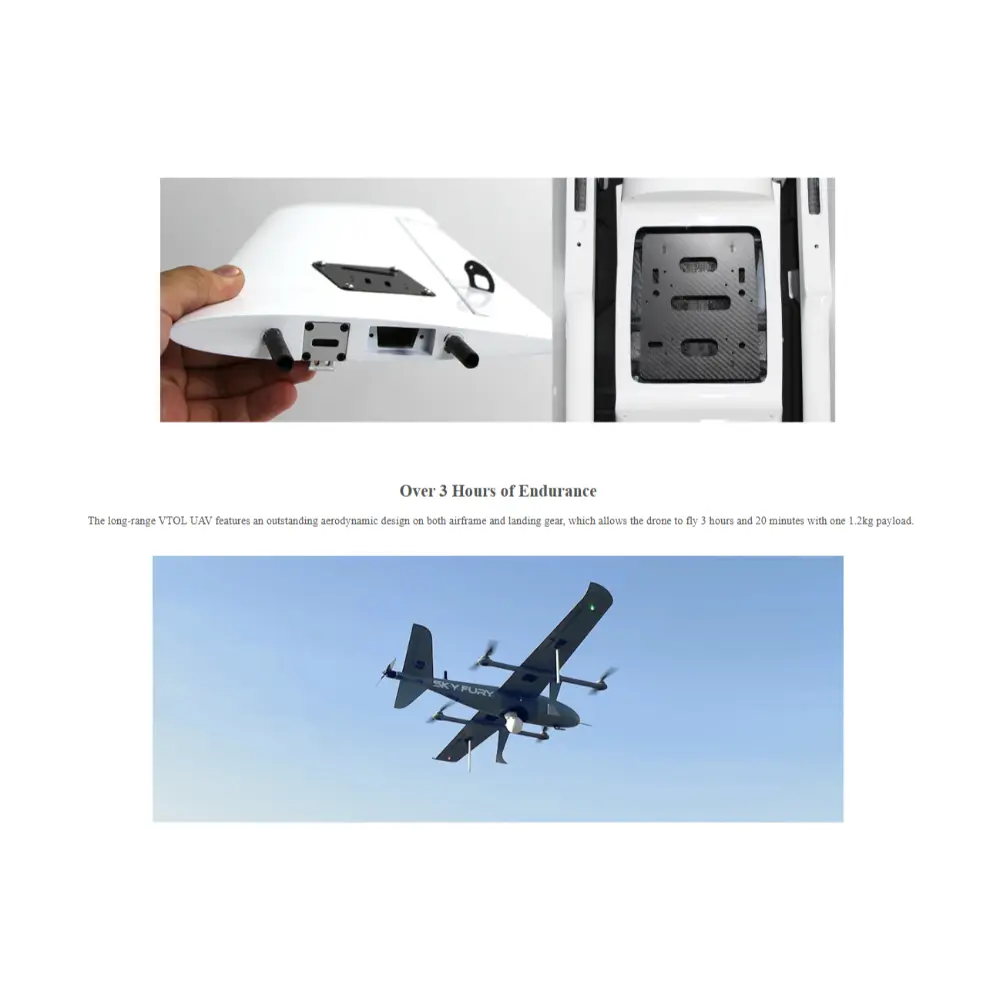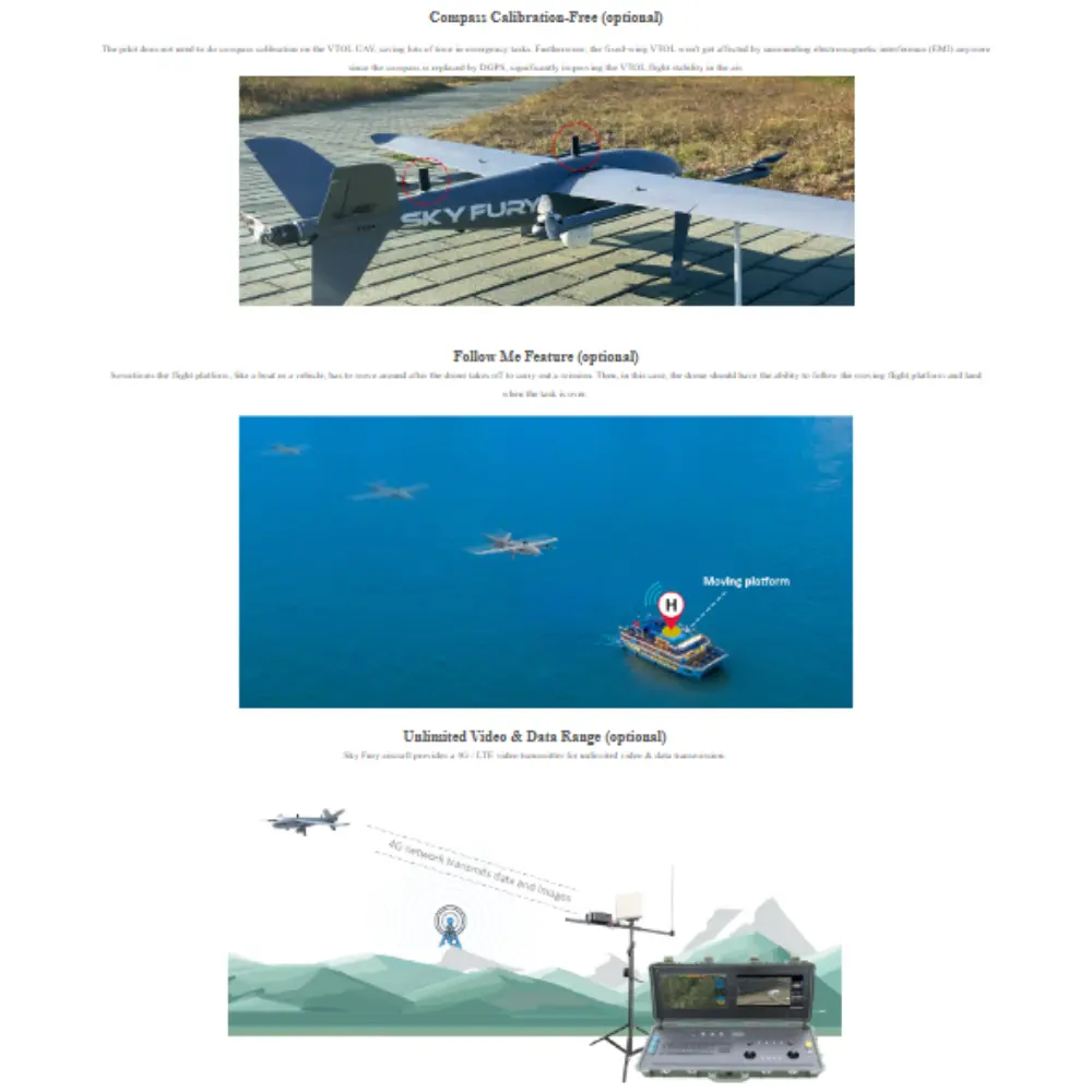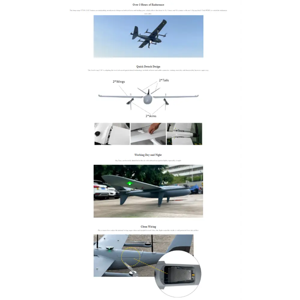 The YANGDA Sky Fury Long Endurance VTOL Drone is a professional-grade electric VTOL drone designed for long-endurance missions, offering over 3 hours of flight time with 1.2 kg of payload. It is built for demanding applications such as security and surveillance, search and rescue, mapping, and cargo delivery. Its design combines four lift motors with a fixed-wing push-prop system, enabling vertical takeoff like a helicopter and efficient horizontal flight like an airplane. The airframe is made entirely of carbon fiber, ensuring durability and lightweight performance. With a wingspan of 2.5 meters and a maximum takeoff weight of 13.5 kg, the drone achieves a cruise speed of 68–108 km/h and can reach a maximum speed of 150 km/h. It operates at altitudes up to 3,500 meters and withstands winds up to 43 km/h. Key features include a quick-detach design for easy assembly, navigation lights for night operations, and clean internal wiring protected by an avionics box. The drone is equipped with ADS-B for air traffic visibility, optional DGPS for compass-free calibration, and a Follow Me mode for mobile platforms. It supports a wide range of payloads, including Sony mapping cameras and advanced EO/IR zoom gimbals for day and night missions. Additionally, operators benefit from the LAUNCH ground control software, which makes piloting accessible even to beginners. Optional 4G/LTE connectivity provides unlimited video and data transmission, extending its versatility for real-time monitoring. The YANGDA Sky Fury is a robust, versatile, and endurance-focused VTOL UAV that balances efficiency, payload capacity, and ease of use, making it ideal for professional aerial operations across multiple industries.