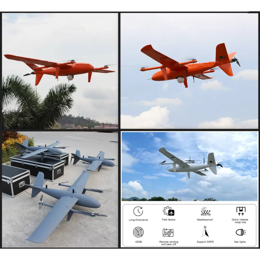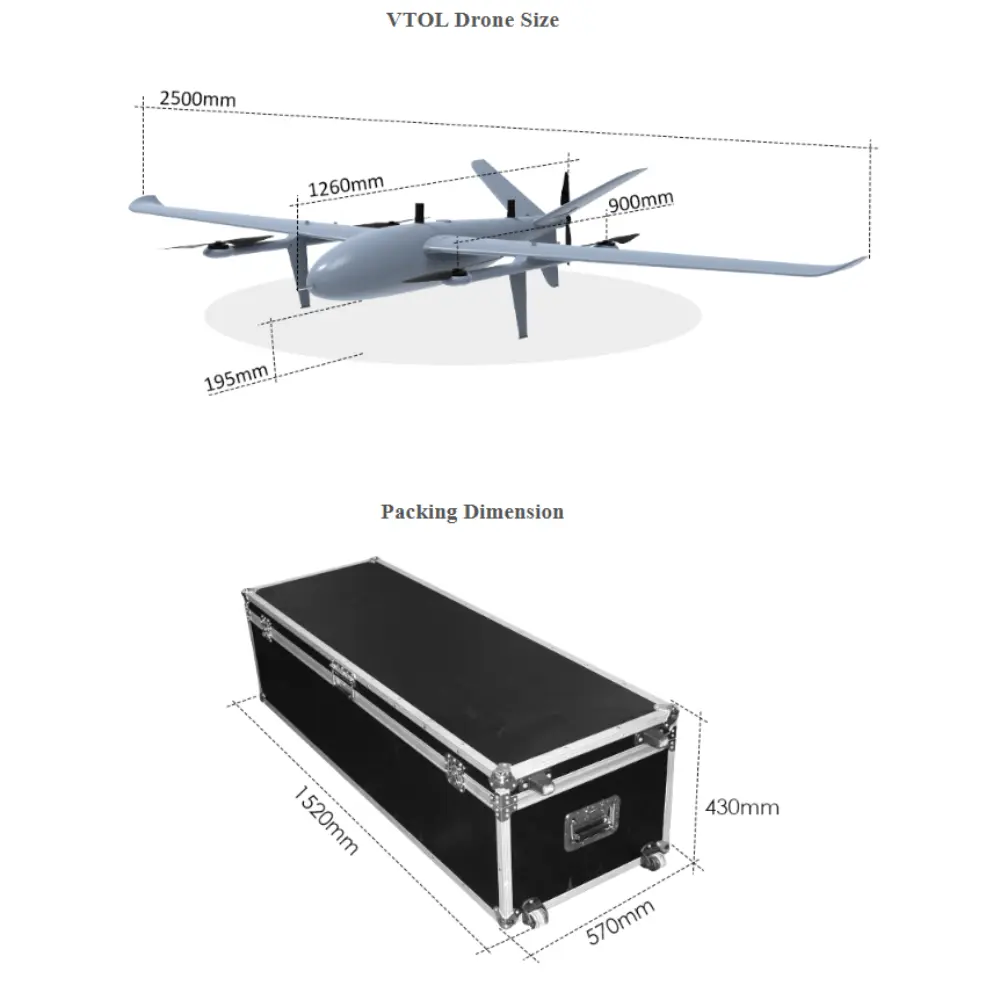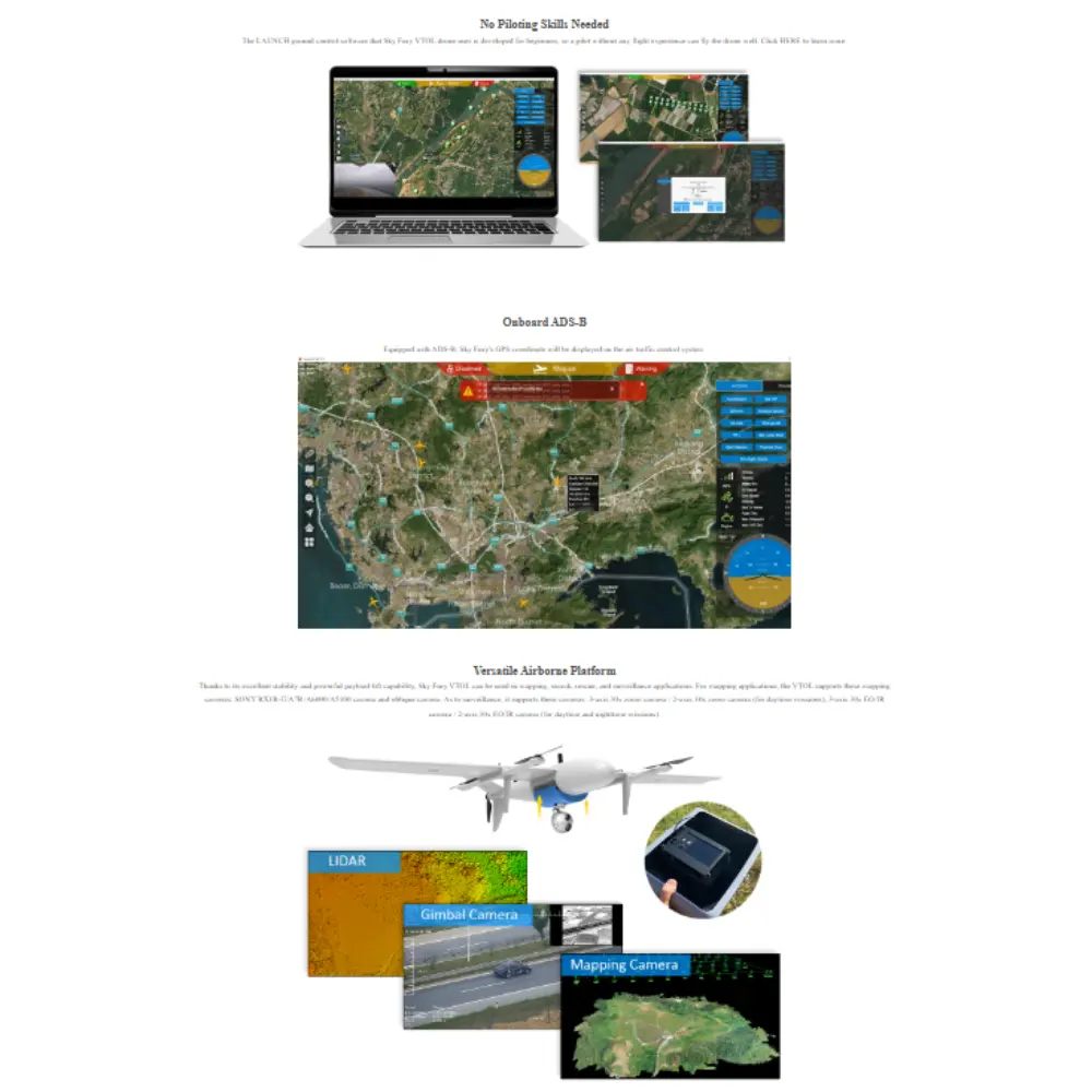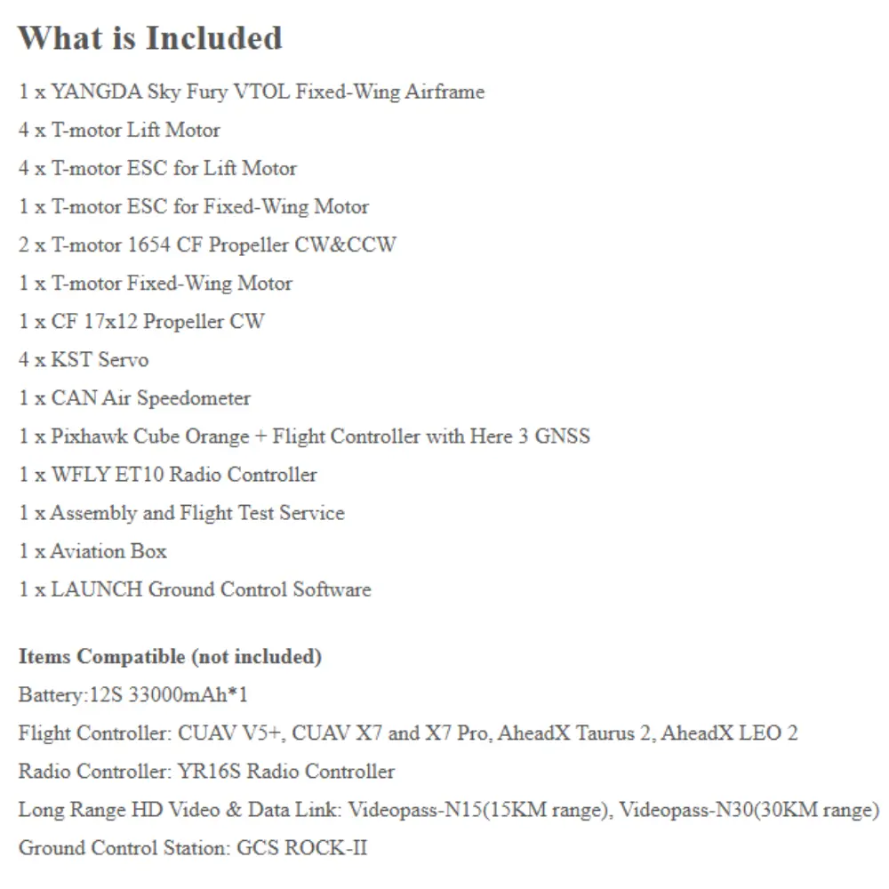 The YANGDA Sky Fury Long Endurance VTOL Drone is a professional-grade electric VTOL drone designed for long-endurance missions, offering over 3 hours of flight time with 1.2 kg of payload. It is built for demanding applications such as security and surveillance, search and rescue, mapping, and cargo delivery. Its design combines four lift motors with a fixed-wing push-prop system, enabling vertical takeoff like a helicopter and efficient horizontal flight like an airplane. The airframe is made entirely of carbon fiber, ensuring durability and lightweight performance. With a wingspan of 2.5 meters and a maximum takeoff weight of 13.5 kg, the drone achieves a cruise speed of 68–108 km/h and can reach a maximum speed of 150 km/h. It operates at altitudes up to 3,500 meters and withstands winds up to 43 km/h. Key features include a quick-detach design for easy assembly, navigation lights for night operations, and clean internal wiring protected by an avionics box. The drone is equipped with ADS-B for air traffic visibility, optional DGPS for compass-free calibration, and a Follow Me mode for mobile platforms. It supports a wide range of payloads, including Sony mapping cameras and advanced EO/IR zoom gimbals for day and night missions. Additionally, operators benefit from the LAUNCH ground control software, which makes piloting accessible even to beginners. Optional 4G/LTE connectivity provides unlimited video and data transmission, extending its versatility for real-time monitoring. The YANGDA Sky Fury is a robust, versatile, and endurance-focused VTOL UAV that balances efficiency, payload capacity, and ease of use, making it ideal for professional aerial operations across multiple industries.